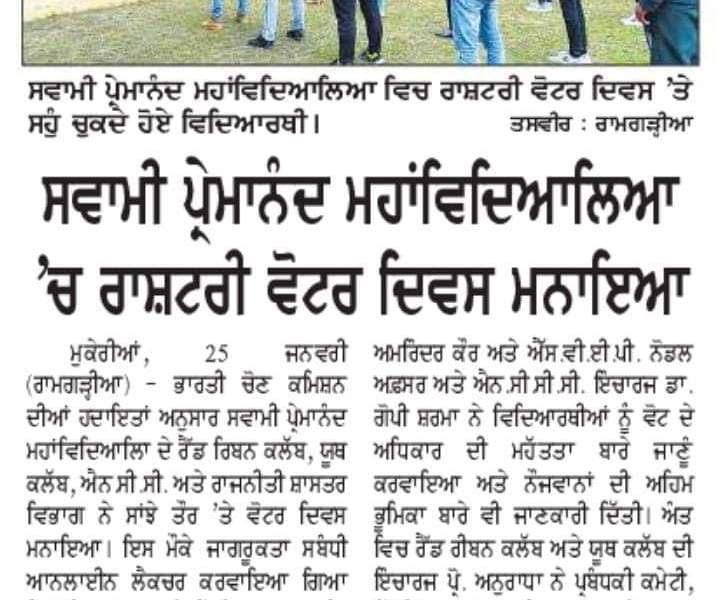 The Red Ribbon Club, Youth Club, NCC and Political Science department of Swami Premanand Mahavidyalaya, Mukerian celebrated Voters Day on 25 January 2022 to encourage more young voters to take part in the electoral process. Apprising about the significance of this day, Principal Dr. Sameer Sharma stated that […]
