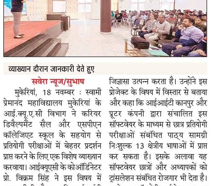 IQAC of Swami Premanand Mahavidyalaya Mukerian in collaboration with Career Development Cell and SPN Collegiate Sen. Sec. School organized a guest lecture on the topic “SATHEE: Self Assessment, Test and Help for Entrance Exams”. The keynote speaker Dr. Shivani Kohli made students acquainted with an innovative online education […]