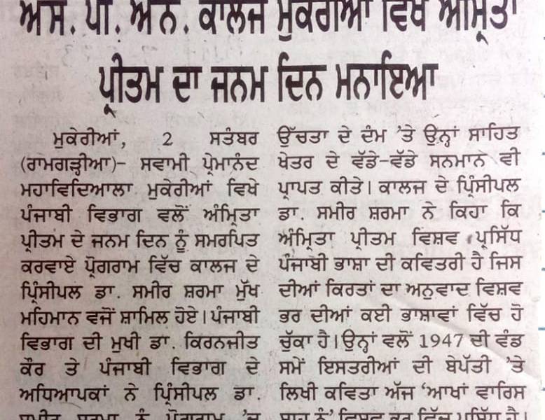 Post graduate Department of Punjabi at Swami Premanand Mahavidyalaya, Mukerian organized an event to commemorate the birth anniversary of the Legend Amrita Pritam. Principal, Dr. Sameer Sharma invited as the chief guest in the program congratulated the students and the staff on this occasion.He further illustrated the that […]
