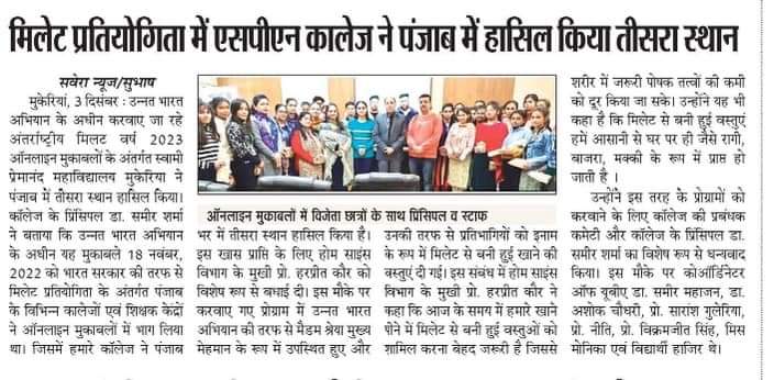 Swami Premanand Mahavidyalaya, Mukerian bagged third position in an online competition on “International Year of Millets 2023”. The aim of this competition was to create awareness about the health benefits of millet. Principal Dr. Sameer Sharma said that various colleges and academic institutions from Punjab took part in […]