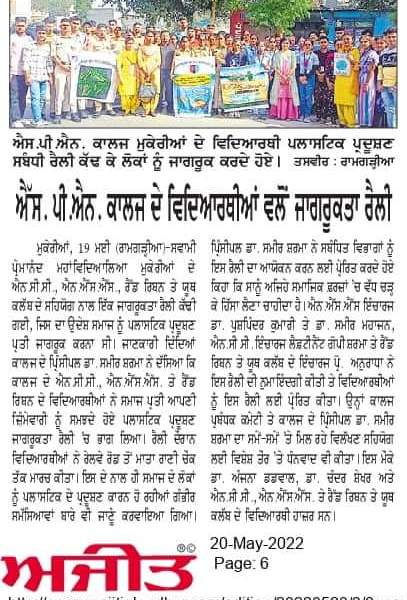 Awareness Rally on Plastic Pollution organised by S.P.N College, Mukerian
